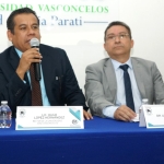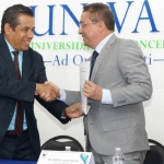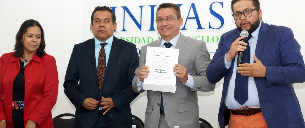 El rector de la UNIVAS, Hugo López Hernández, y el director del Instituto de Formación y Capacitación Profesional de la Fiscalía, Mayolo García García, hicieron entrega de un reconocimiento al fiscal brasileño.