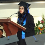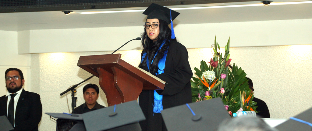 Tras recibir la medalla al mérito académico, la egresada de la licenciatura en Derecho, Arianne Patricia Torres Crespo, pronunció un mensaje a nombre de la Generación 2012-2015.