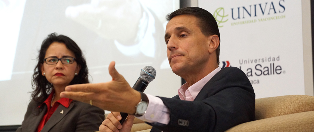 Tras la intervención del invitado especial, los rectores Rodrigo del Val Martín, (Anáhuac Oaxaca), María del Rocío Ocádiz Luna (La Salle Oaxaca), Hugo López Hernández (UNIVAS) y el anfitrión Benjamín Alonso Smith Arango (URSE) participaron en el panel “Reconciliación y esperanza”.